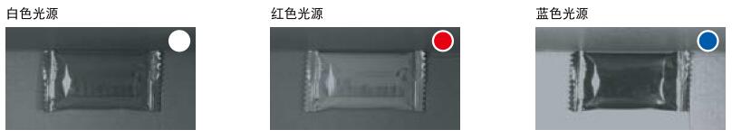 光源顏色對視覺檢測效果有什么影響呢?來看一個例子,將紅色的糖果包裝紙放入棕色紙盒中,圖中顯示了使用白色、紅色和藍色光源時各自的對比度水平。