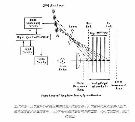目標(biāo)與傳感器的距離決定了光線穿過(guò)接收器透鏡的角度;然后,該角度確定接收到的光將照射到線性成像器的位置。如果目標(biāo)距離較遠(yuǎn)(在最大指定范圍內(nèi)),則光將朝成像器最靠近激光發(fā)射器的一端落下?;蛘撸绻繕?biāo)位于其最接近的位置(在最小指定范圍內(nèi)),則光將降落在成像儀的相對(duì)端,距激光發(fā)射器最遠(yuǎn)。線性成像儀上的光線位置在出廠時(shí)已針對(duì)所有有效目標(biāo)距離進(jìn)行了校準(zhǔn)。接收到的光通過(guò)模擬和數(shù)字電子設(shè)備進(jìn)行處理,并由數(shù)字信號(hào)處理器(DSP)進(jìn)行分析。